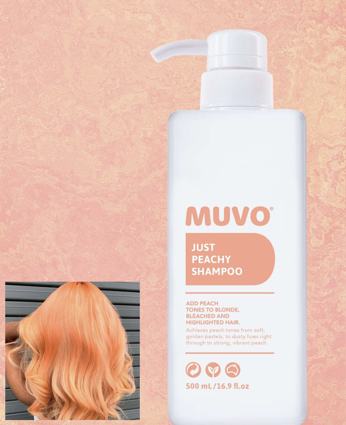Pyszny szampon MUVO Just Peachy zmienia blond, rozjaśniane i rozjaśniane włosy w miękkie i przydymione, świeże i pełne życia, a nawet w mocne i intensywne odcienie brzoskwini.